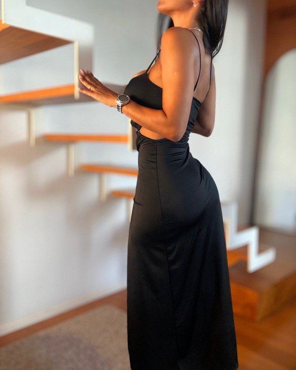 Vestido largo al tobillo de microfibra con aberturas varias y argollitas y tajo profundo.