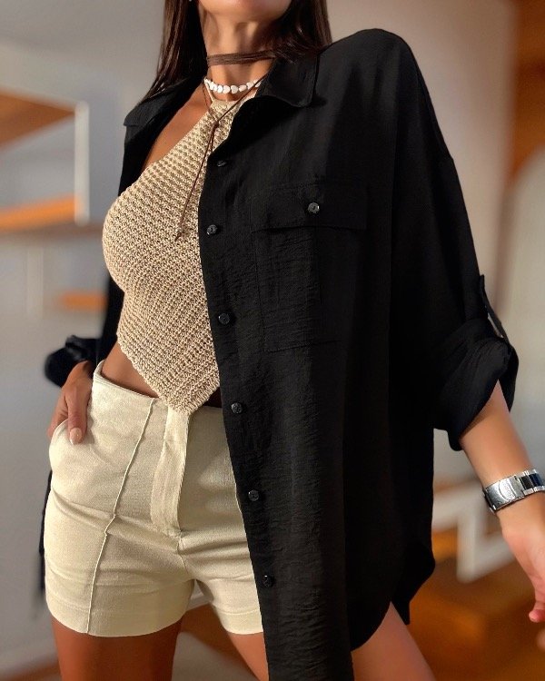 Camisa de crepe elastizado con textura holgada oversize con mangas largas de cuello solapa sin puños. Tiene charretera intera en las mangas para acortarlas. Bolsillos y botones frontales.